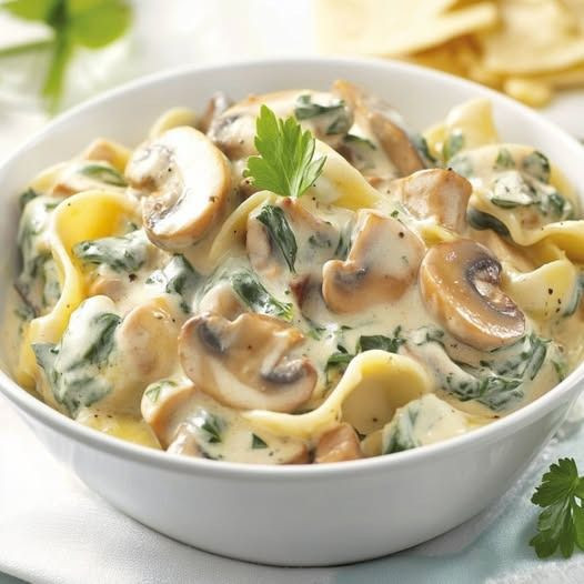 Makaron ze szpinakiem i pieczarkami